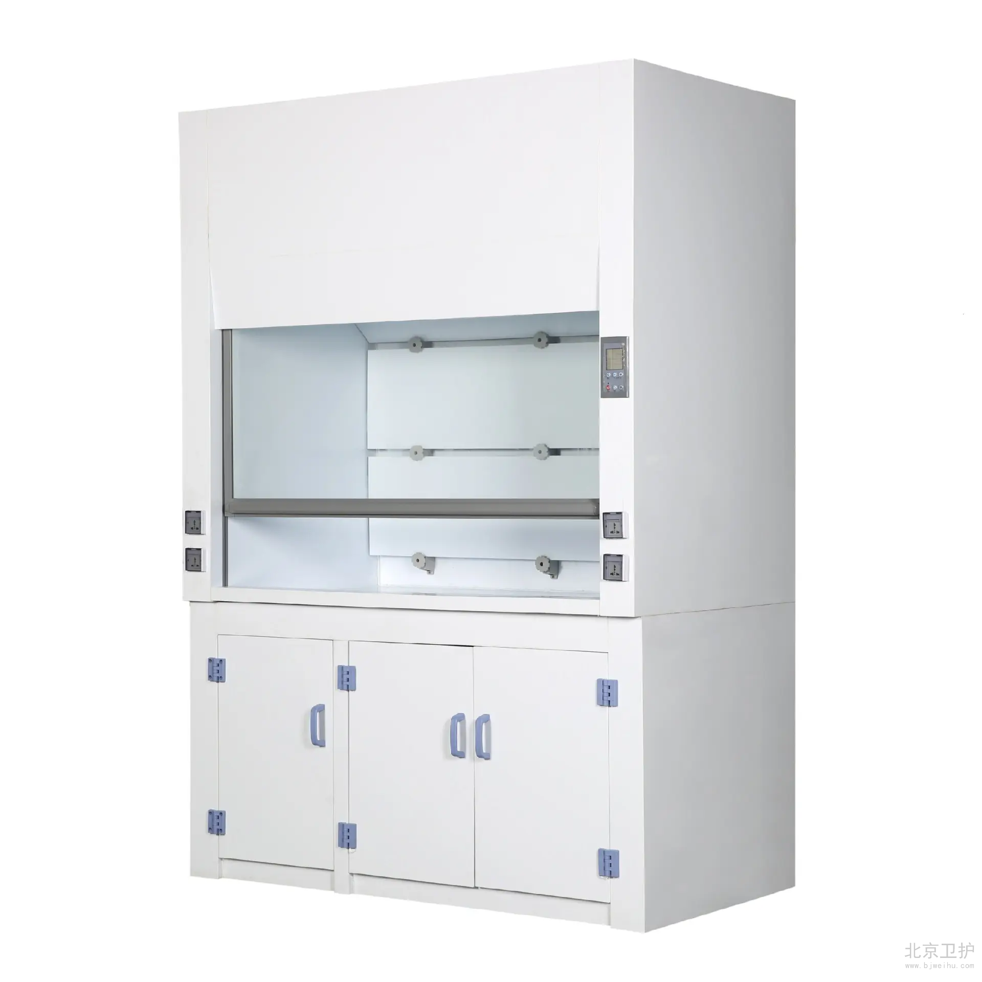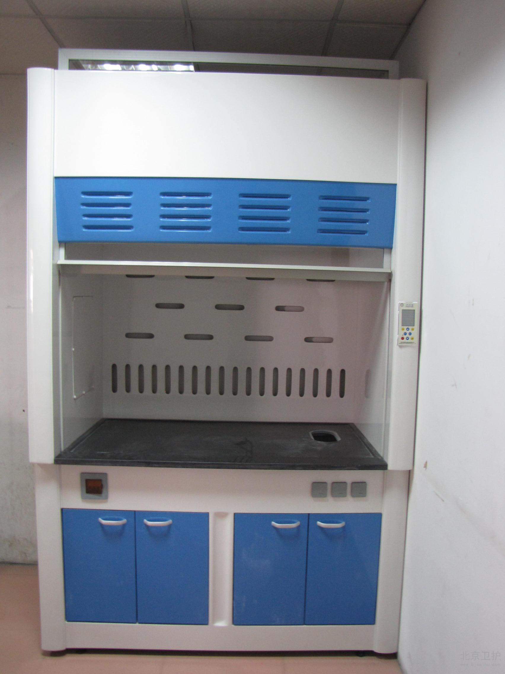 通風(fēng)柜是實(shí)驗(yàn)室家具中必不可少的一種。在實(shí)驗(yàn)室中起到排風(fēng)和換氣的功效。通風(fēng)柜的結(jié)構(gòu)是上下式,其頂部有排氣孔,可安裝風(fēng)機(jī)。上柜中有導(dǎo)流板,電路控制觸摸開關(guān),電源插座等 ,透視窗采用鋼化玻璃,可左右或上下移動。供人操作。下柜采用實(shí)驗(yàn)邊臺樣式,上面有臺面,下面是柜體。臺面可安裝小水杯和龍頭。通風(fēng)柜的材料由多種的,全鋼、鋼木、全木、鋁木、塑鋼、PVC結(jié)構(gòu)等,其臺面是直接與操作者接觸的地方,由實(shí)芯理化板,不銹鋼板,PVC,陶瓷等材料組成。舊式通風(fēng)柜多用木材制成,但現(xiàn)代多為涂有環(huán)氧樹脂的鋼材制造。常見柜寬為1000、1200、1500、1800和2000毫米幾個(gè)規(guī)格,深700-900毫米,高1900-2400毫米。可供1-3個(gè)人同時(shí)使用。 通風(fēng)柜一般靠墻安裝。前方中間為可上下移動的透明門(多為玻璃),開啟高度一般為100-600毫米。門后為實(shí)驗(yàn)進(jìn)行的工作面,有水管、下水道、電源、真空泵、氣路管線等實(shí)驗(yàn)需要的連接,上有帶保護(hù)罩的燈照明??諝庥晒駜?nèi)前上方的排風(fēng)扇抽走后,或經(jīng)管道引到別處(稱為全通風(fēng)),或經(jīng)過濾重新循環(huán)使用(成為無管通風(fēng))。多數(shù)通風(fēng)柜在(1)排氣量過?。?)前方玻璃門開啟過大的時(shí)候會發(fā)出警報(bào),提醒操作者注意,一般玻璃門開啟后操作口風(fēng)速不應(yīng)低于0.5m/s,內(nèi)部的排風(fēng)扇速度和燈都有開關(guān)可調(diào)。使用的時(shí)候人站或坐于柜前,將玻璃門盡量放低,手通過門下伸進(jìn)柜內(nèi)進(jìn)行實(shí)驗(yàn)。由于排風(fēng)扇通過開啟的門向內(nèi)抽氣,在正常情況下有害氣體不會大量溢出。